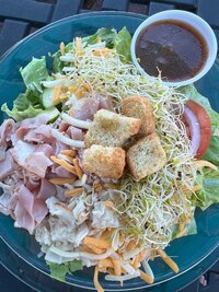 Made extra crunchy with slivered almonds and topped with alfalfa sprouts